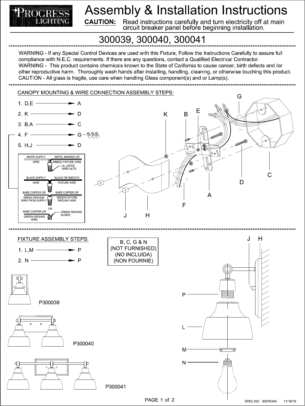 CLII Assembly & Installation Instructions BTN CAUTION: Read instructions carefully and turn electricity off at main circuit breaker panel before beginning installation. 300039, 300040, 300041 WARNING If any Special Control Devices are used with this Fixture, Follow the Instructions Carefully to assure full compliance with N.E.C. requirements. If there are any questions, contact a Qualified Electrical Contractor.