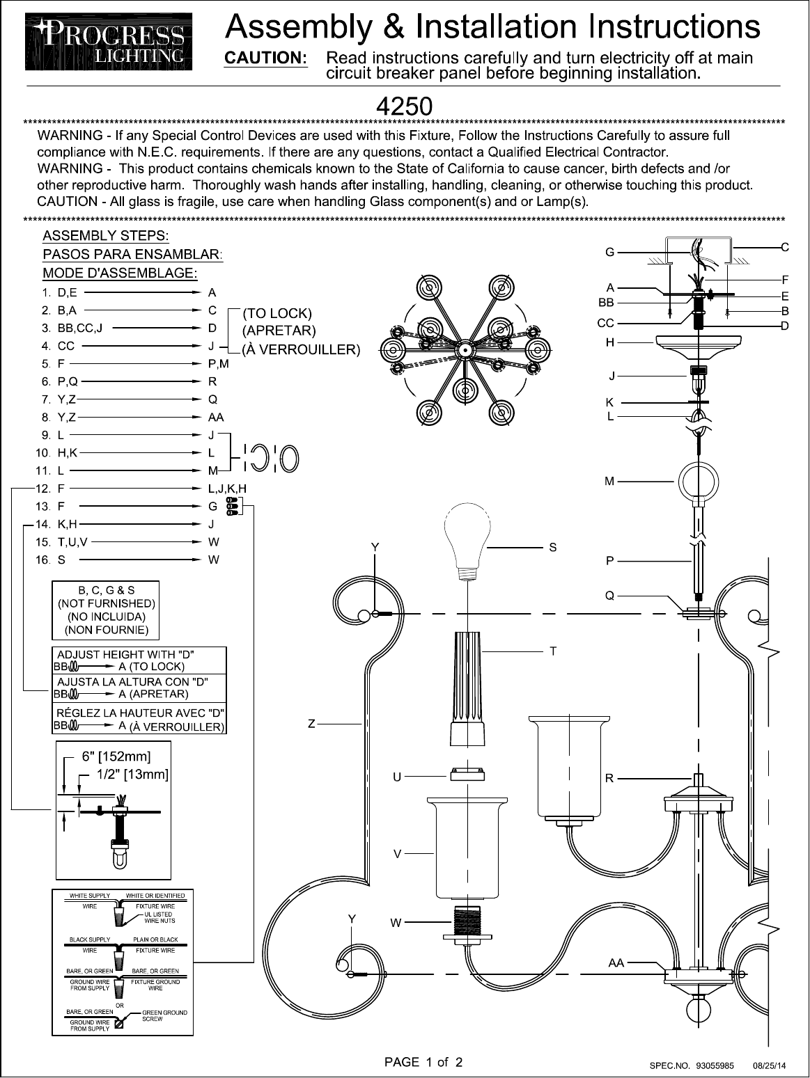 U Assembly & Installation Instructions TINCTURING CAUTION: Read instructions carefully and tum electricity off at main circuit breaker panel before beginning installation. 4250 WARNING If any Special Control Devices are used with this Fixture, Follow the Instructions Carefully to assure full compliance with N E.C. requirements. If there are any questions, contact a Qualified Electrical Contractor.