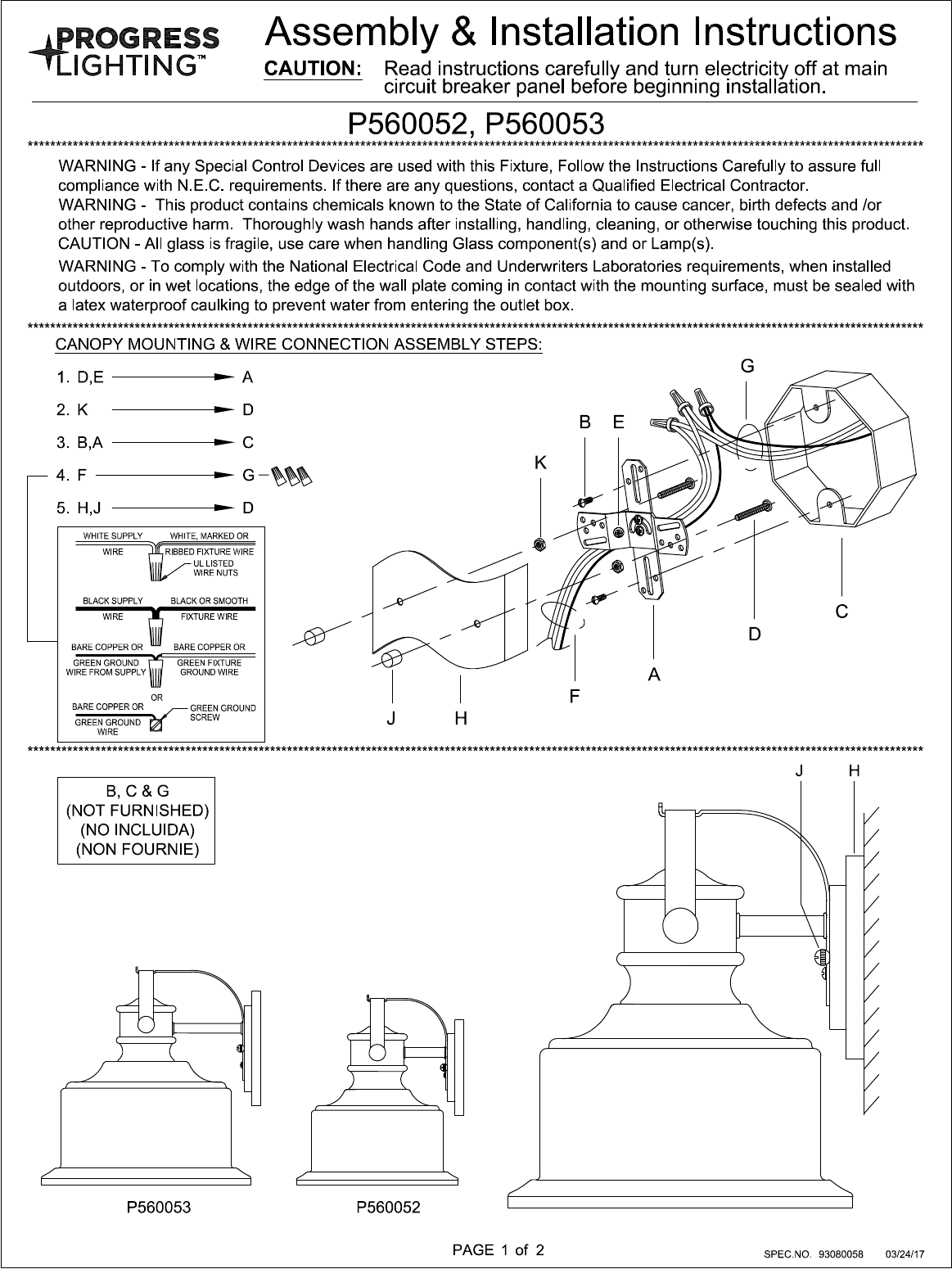 R Ogress Assembly & Installation Instructions IGHTING™ CAUTION: Read instructions carefully and tum electricity off at main circuit breaker panel before beginning installation. P560052, P560053 WARNING If any Special Control Devices are used with this Fixture, Follow the Instructions Carefully to assure full compliance with N.E.C. requirements. If there are any questions, contact a Qualified Electrical Contractor.