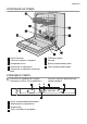 progress 5 ОПИСАНИЕ НА УРЕДА 1 2 3 4 5 Горна кошница Скала за твърдост на водата Резервоар за сол Отделение за препарати Отделение за препарат за изплакване 6 7 8 9 Табелка с данни Филтри Долно разпръскващо рамо Горно разпръскващо рамо КОМАНДНО ТАБЛО Бутоните за управление са върху командното табло. За да работите с 1 A B 4 1 2 3 4 Бутон за включване/изключване Индикатори на програмите Индикатори Бутон за избор на програма бутоните, дръжте вратичката на уреда отворена.