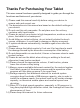 Thanks For Purchasing Your Tablet This user manual has been specially designed to guide you through the functions and features of your device. 1) Please read this manual carefully before using your device to ensure safe and correct use. 2) The descriptions in this manual are based on the default settings of your device. 3) Do not use this unit near water. Do not place over the unit any container with liquid inside.