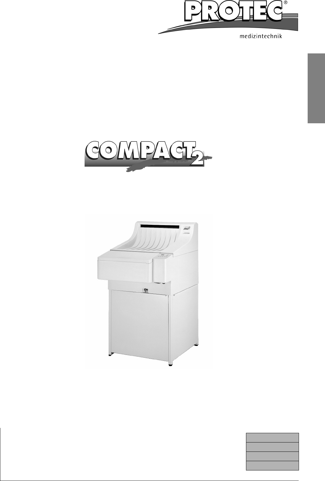 English TM SX 2 Film Processor Operation Manual Depending on model type the Compact 2 has either an open stand or like shown here a closed cabinet. Machine No.: Type: PROTEC® Medizintechnik GmbH & Co. KG Lichtenberger Straße 35, D-71720 Oberstenfeld, Germany Telephone: +49-7062-9255-0 e-mail: service@protec-med.com Date of installation: Issued: 05-2006/2.