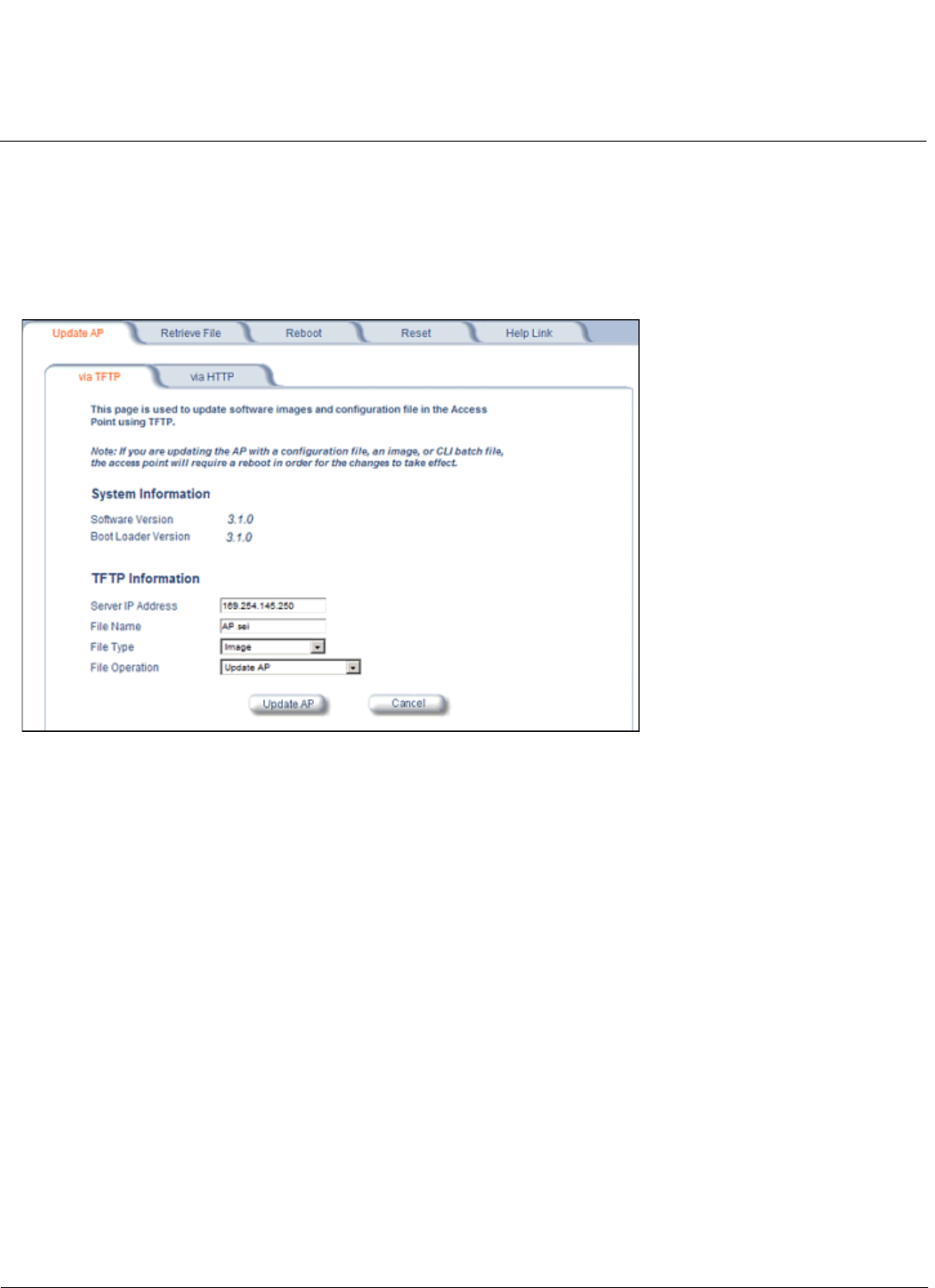 The Update AP via TFTP tab shows version information and allows you to enter TFTP information as described below.