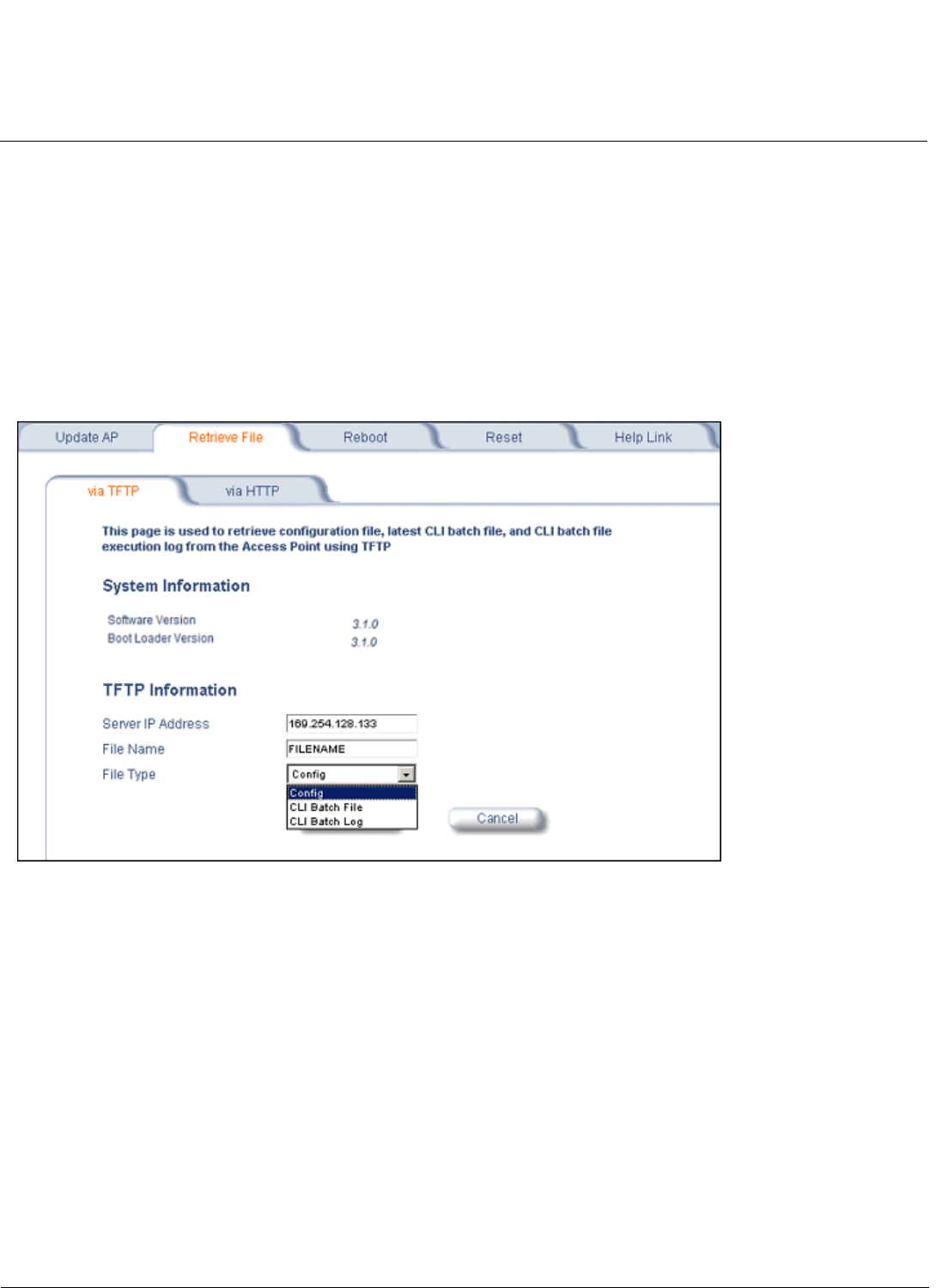 Use the Retrieve File via HTTP tab to retrieve configuration files, CLI Batch Files, or CLI Batch Logs from the AP. Select