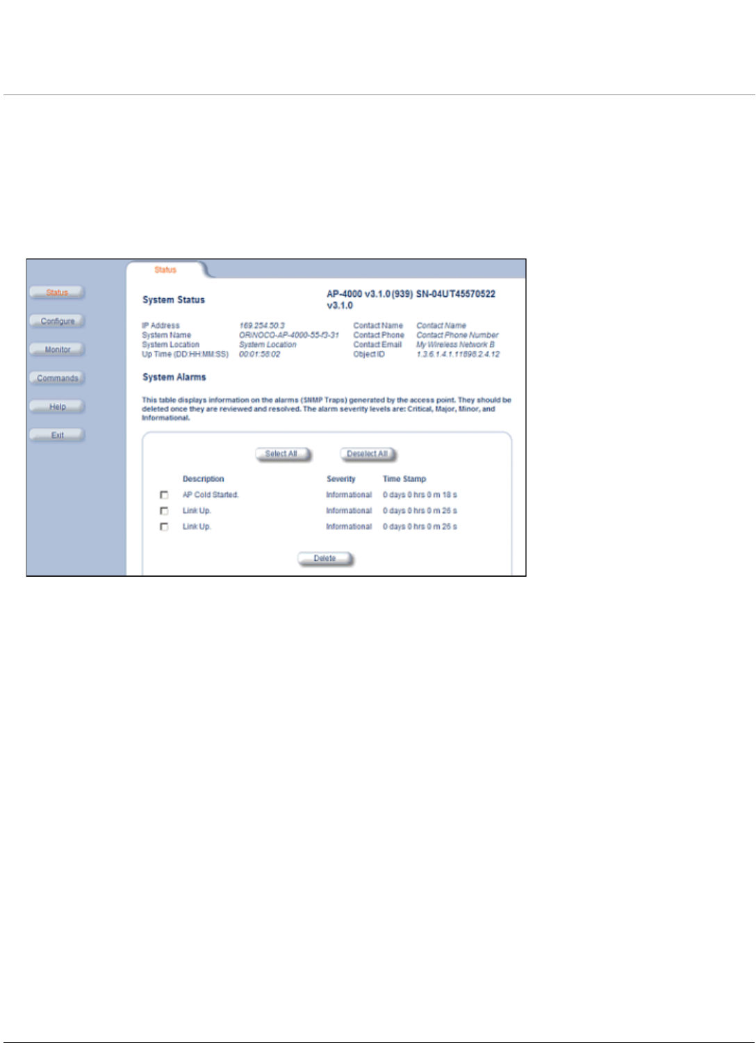 • System Alarms: System traps (if any) appear in this area. Each trap identifies a specific severity level: critical, major,