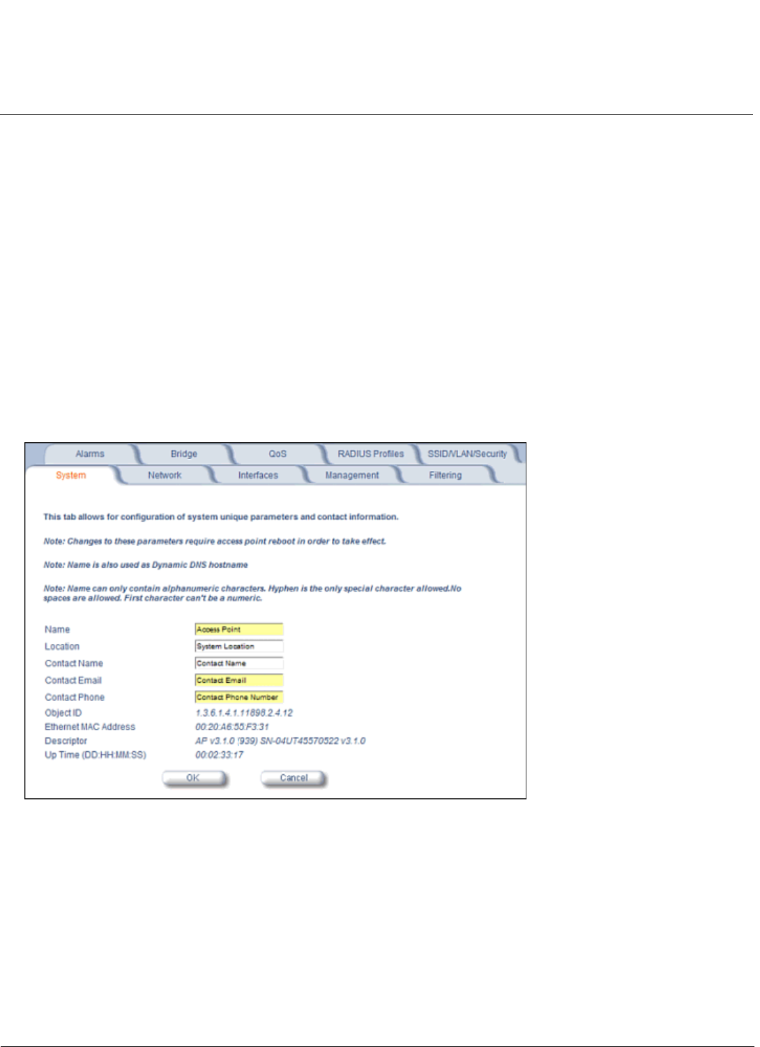 • Descriptor: This is a read-only field that reports the Access Point’s name, serial number, current image software