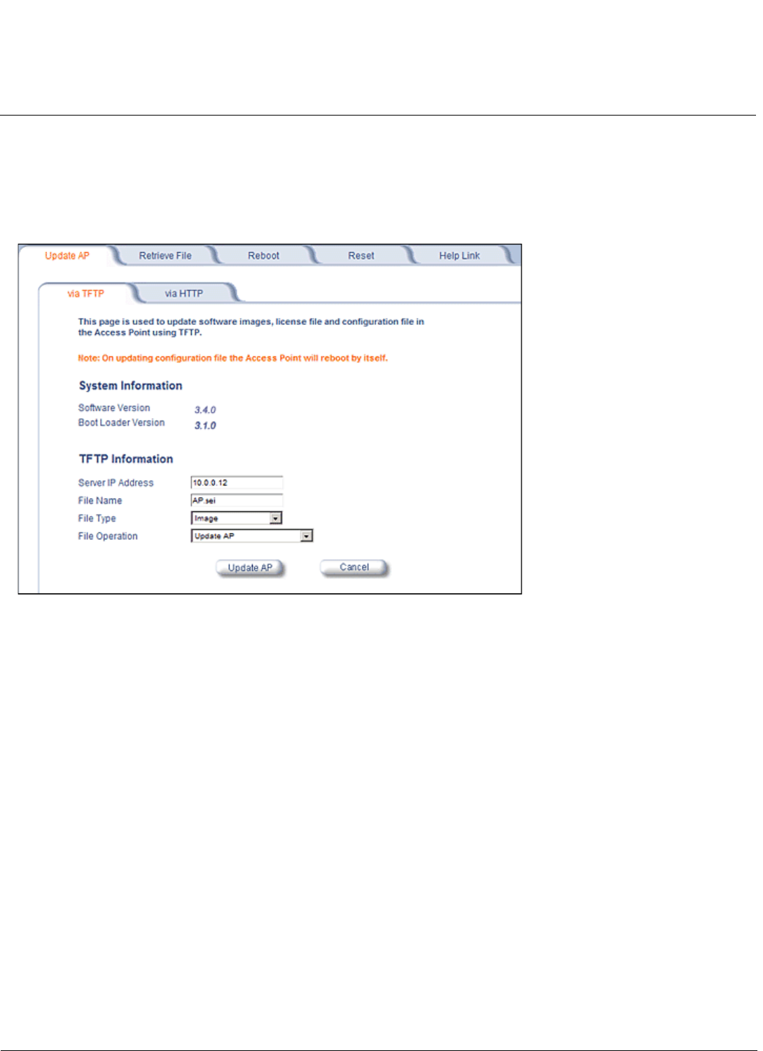 Use the Update AP via TFTP tab to download Configuration, AP Image, Bootloader files, Certificate and Private Key files,