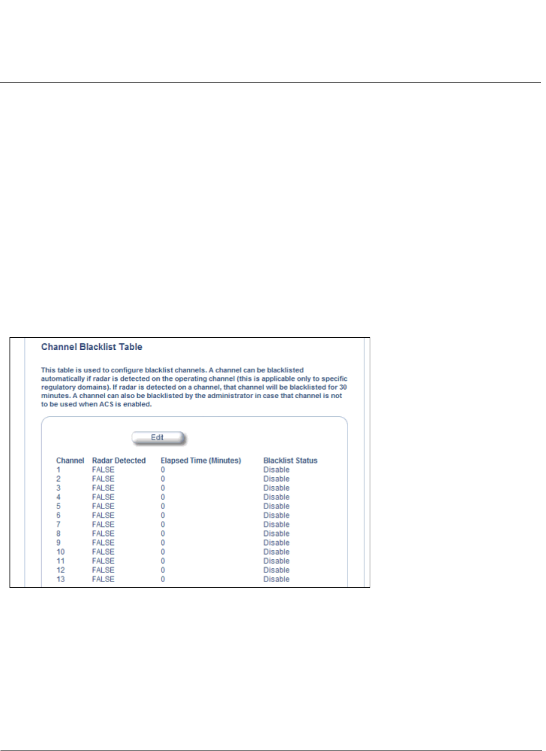 The Channel Blacklist table contains all available channels (channels vary based on regulatory domain). It can be used to