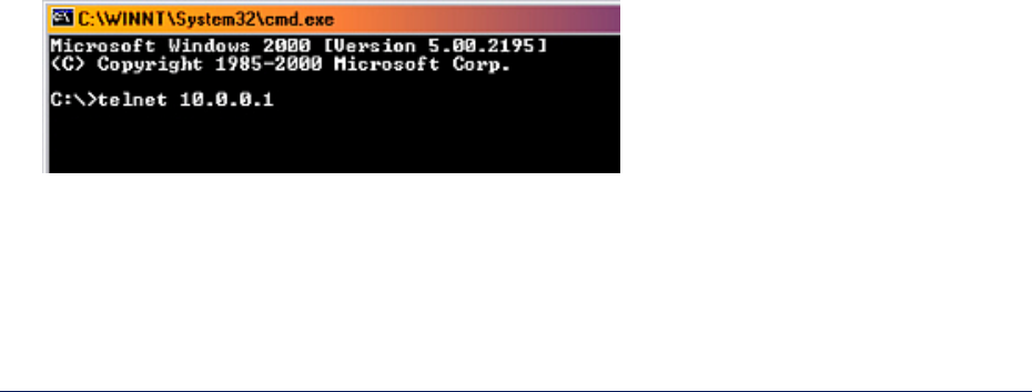 2. Enter telnet followed by the IP address, as shown in the following sample DOS command