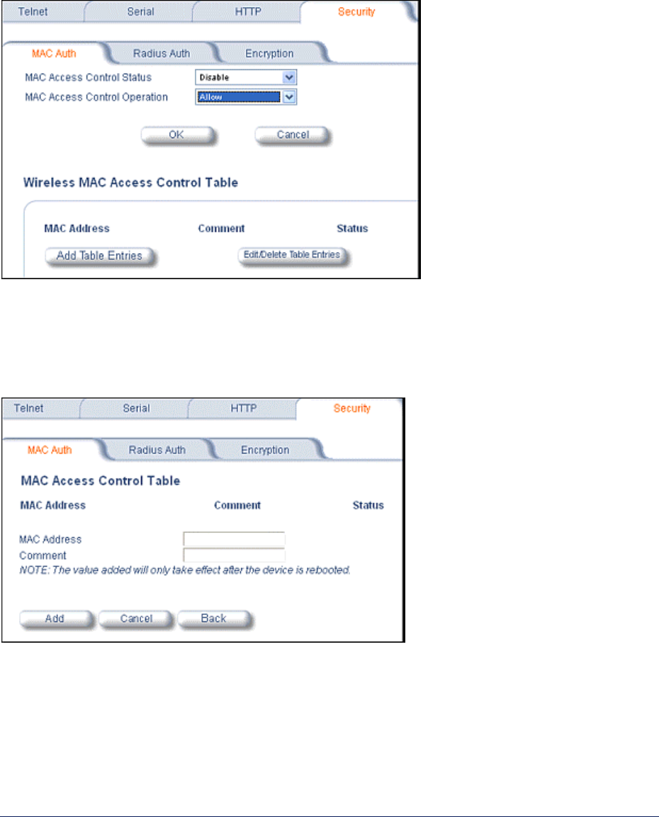 Click the Configure button, the Security tab, and the MAC Auth sub-tab to build a list of authorized