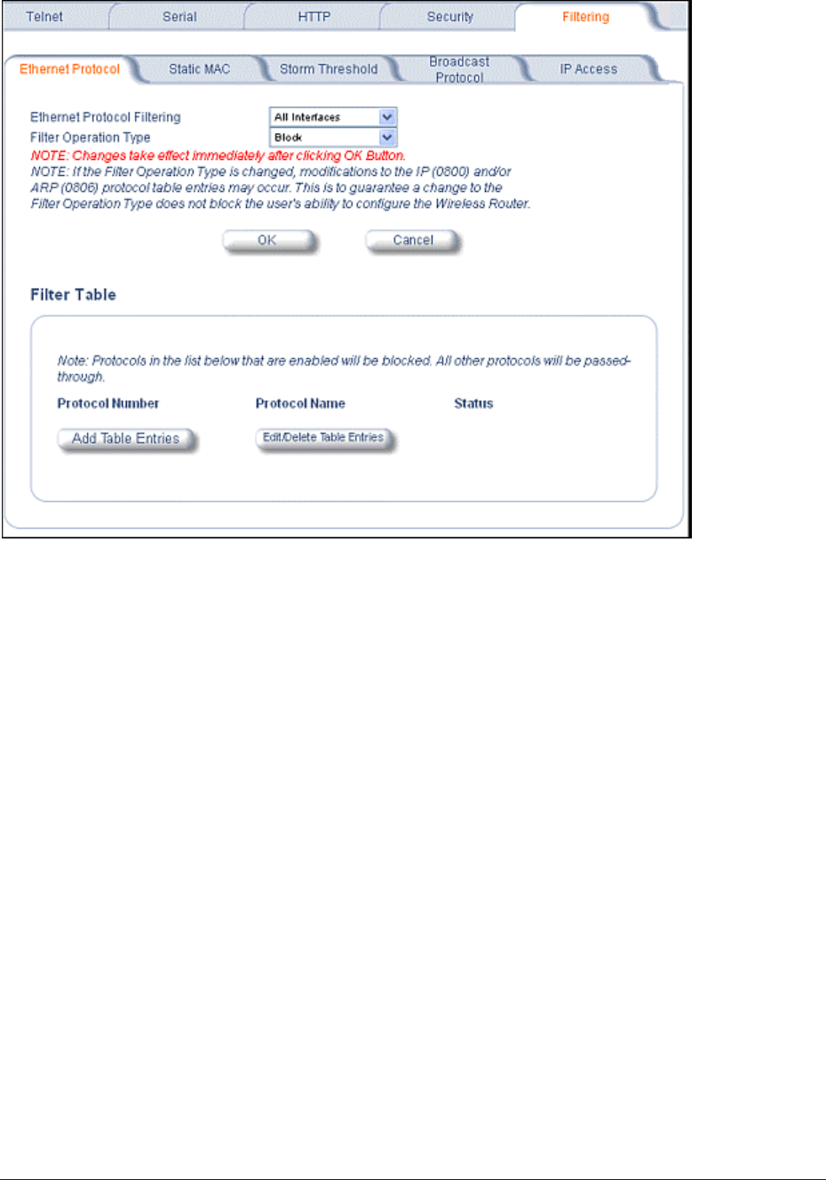 Block: the Bridge blocks enabled Ethernet Protocols listed in the Filter Table.