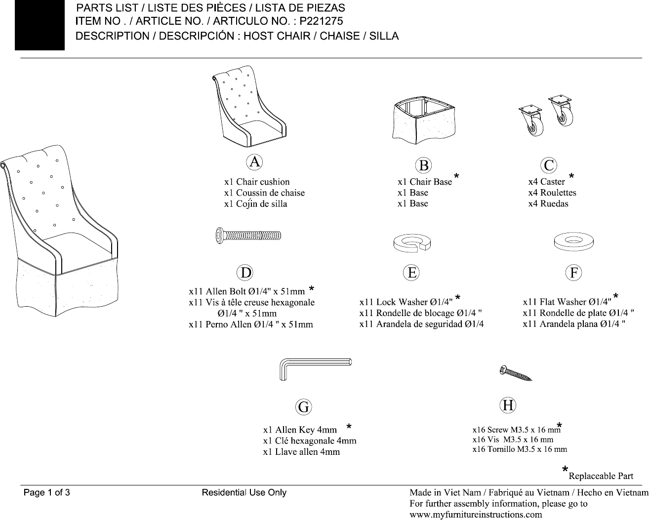 ASSEMBLY INSTRUCTIONS / NOTICE DE MONTAGE / INSTRUCTIONS DE MONTAGE ITEM NO ./ ARTICLE NO. / ARTICULAR NO. : P221275 DESCRIPTION / DESCRIPTION : HOST CHAIR / CHAISE / SILLS Use long am of Allen key to attach Please remove Page 20f 3 Residential Use Only Made in Diet Nam / Fabric au Vietnam / Echo en Vietnam For further assembly information, please go to www.myfumitureinstructions.