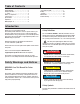 Table of Contents Safety Warnings. . . . . . . . . . . . . . . . . . . . . . . . 1 Safety Instructions. . . . . . . . . . . . . . . . . . . . . . 2 CO Sentry. . . . . . . . . . . . . . . . . . . . . . . . . . . . . 4 Names of Components. . . . . . . . . . . . . . . . . . . 5 Control Panel . . . . . . . . . . . . . . . . . . . . . . . . . . 6 Specifications . . . . . . . . . . . . . . . . . . . . . . . . . 7 Preparation. . . . . . . . . . . . . . . . . . . . . . . . . . . . 8 Adding Engine Oil. . . . . . . .