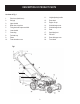 DESCRIPTION OF PRODUCT PARTS As shown in Fig 1 1. Drive lever (clutch lever) 2. Soft grip 3. Upper handle 4. Brake lever /stop lever 5. Fixing knob with square neck bolt 6. Lower handle 7. Grass bag 8. Fuel tank cap 9. Primer 10. Front decorative cover Fig 1 3 11. Height adjusting handle 12. Rear wheel 13. Engine oil cap 14. Side discharge cover 15. Side discharge chute 16. Deck 17. Spark plug boot 18. Pull start 19. Rear discharge cover 20.
