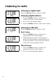 Storing and selecting presets EN You can store up to 10 digital and 10 FM radio stations for quick access and for PRESET RECALL 5PRESET use when setting a radio alarm. DR FM AUX BT 10:00 6EMPTY DIGIROCK 23:00 <4 EMPTY Storing a radio preset 1. Tune into the station that you want to store. DR FM AUX > BT 2. Press the Presets buttons so that the < > PRESET RECALL 5PRESET symbols are shown on6EMPTY the display. DIGIROCK 10:00 3. Scroll < > to the required Preset (1-10). 23:00 4.