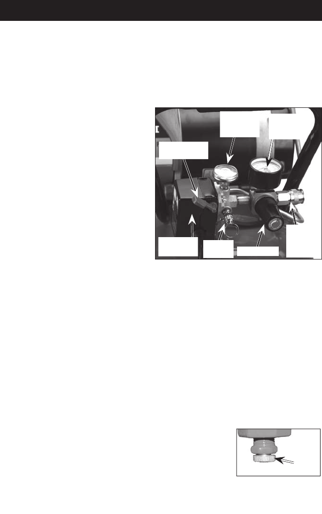 Regulator: Controls the air pressure shown on the outlet pressure gauge. Pull