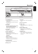 Main Unit 11 10 9 8 7 English Top view 6 5 4 3 2 1 7 Left side view Front view a STANDBY ON 2 g iR sensor – Turns on this unit or turns off to normal standby mode. – Press and hold to turn off to low power standby mode. – Point the remote control towards this sensor. h Disc compartment b SOURCE i USB socket – Selects the relevant active source mode: DISC, USB, DOCK, MP3 LINE-IN, RADIO FM, RADIO AM/MW, TV1, TV2, AUX1, AUX2 or DIGITAL IN.