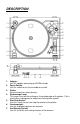 8. Tonearm Lever: Use this lever to lower and raise the tonearm. 9. Tonearm Lock: Use this to lock the tonearm in place when not in use. 10. Tonearm: Keep locked in place when not in use. 11. Pitch Control: Use this slider to vary the pitch of the recording by slightly speeding up or slowing down the rotation of the platter. 12. Headshell: This holds the stylus (“needle”) in place and provide protection by means of its removable stylus protection cap (not shown) 13.