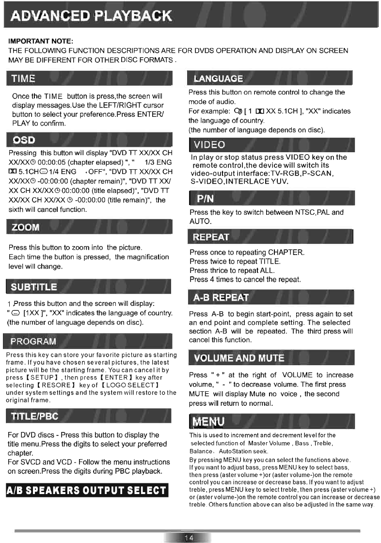 FOLLOWING FUNCTION DESCRIPTIONS ARE FOR DVDS OPERATION AND DISPLAY
