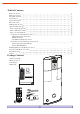 Table of Contents Table of Conte nts Package Contents Safe ty Inform ation Specifications Syst em Connection Rem ote Control LCD Display Syste m Operation Instruct ions How to Open the System How to Play Stereo Audio How to Use Sleep Mode (1) Ope rations of the Remote C ontrol Multi-Fu nction Control Area FM Control Area iPod/iPhone/iPad Control Area (2) Ope rations of Touch Key Control System How to S etup Clock and Ala rm How to P lay F M Tuner Insta lling Battery in the Remote Cont rol Notes abo ut th e