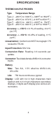 SPECIFICATIONS THERMOCOUPLE PROBES Type Temperature Range Type J: Type K: Type T: Type E: –200°C to 1000°C (–328°F to 1832°F ) –250°C to 1372°C (–418°F to 2501°F ) –250°C to 400°C (–418°F to 752°F ) –250°C to 1000°C (–418°F to 1832°F ) Accuracy > –150°C: ±0.1% of reading, ±0.4°C (±0.7°F) Accuracy < –150°C: ±0.25% of reading, ±1°C (±2°F) Linearization: Conforms to NIST monograph 175 revised to ITS-90. Input Protection: 50V rms Conversion Rate: Reading 0.6 seconds per update.