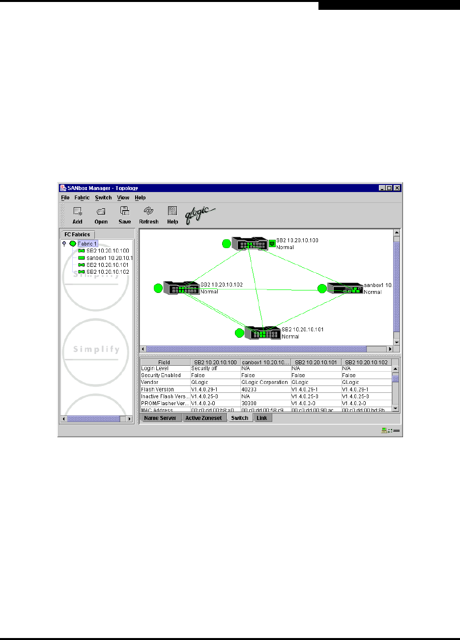 fabric and displays its topology. Switches and inter-switch links (ISL) appear in the