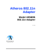 Introduction The Atheros 802.11n Adapter supports 802.11bg operation. The card uses the Atheros Client Utility (ACU) which is a user-mode utility designed to edit and add profiles for selected Atheros network interface adapters. System Requirements Laptop/ PC containing: 32-bit PCI Express Bus 32 MB memory or greater 300 MHz processor or higher Microsoft Windows 2000, Windows Millennium Edition, Windows 98 Second Edition, Windows XP, or Windows NT 4.