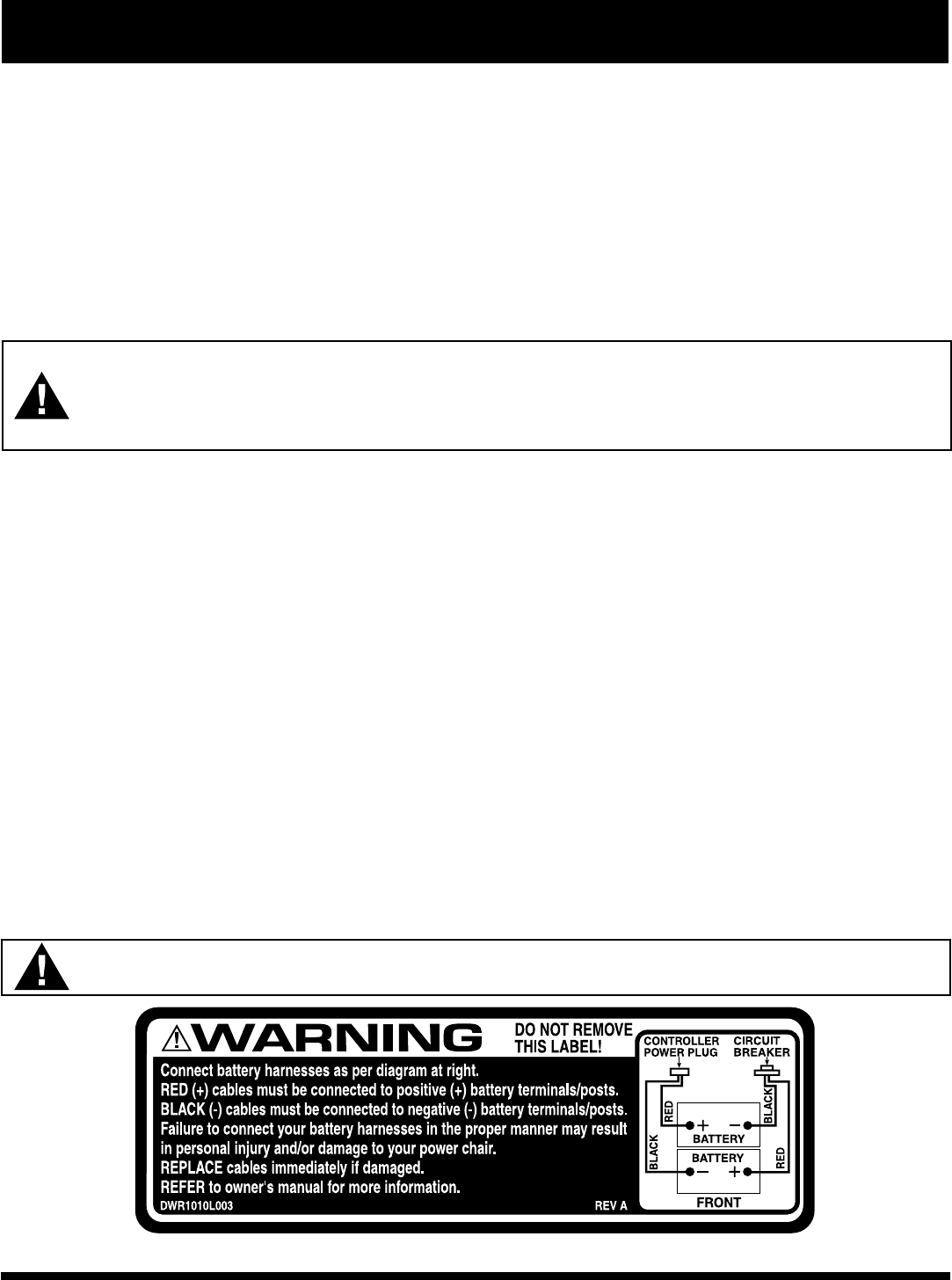 For battery specifications, see VI. Batteries and Charging. A diagram is printed on a decal located on the power chair frame