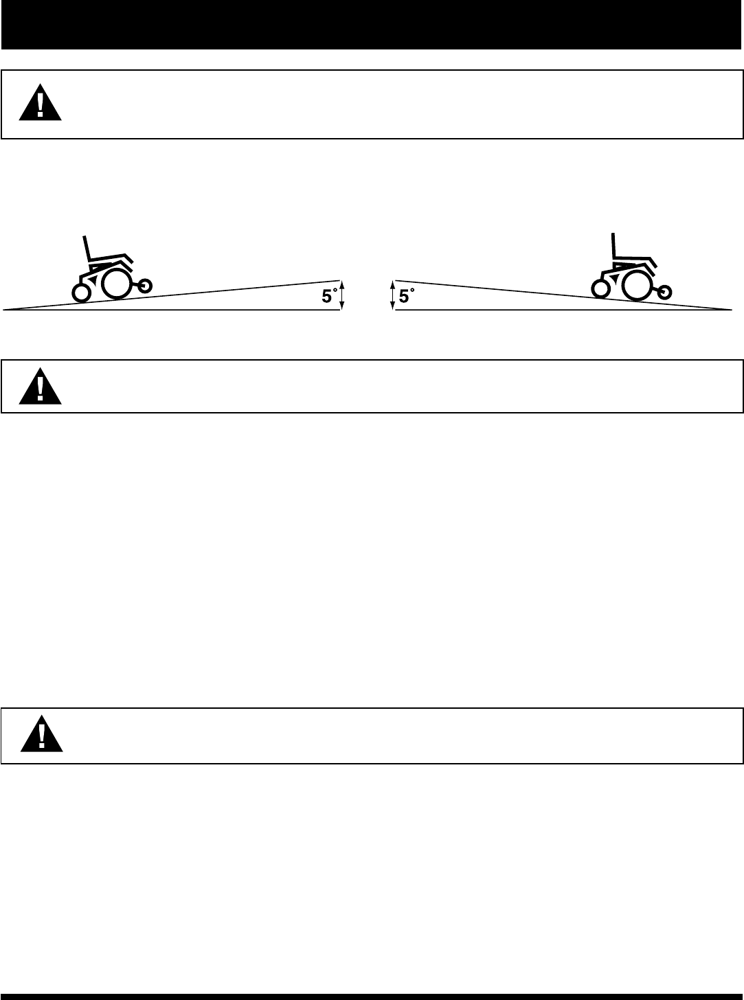 WARNING! Any attempt to climb or descend a slope steeper than 5° may put your power chair in