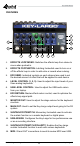 FEATURES 12 11 1 10 2 9 3 4 5 6 7 8 1. EFFECTS LOOP MONO: Switches the effects loop from stereo to mono when pushed in. 2. EFFECTS FOOTSWITCH: Latching footswitch used to turn on or off the effects loop in order to add echo or reverb when soloing. 3. EFX SEND: Individual controls on each channel are used to set the desired amount of effect that will be applied to each device. 4. LEVEL CONTROL (1, 2, 3): Used to adjust the input levels of your three analog keyboards. 5.