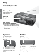 Setup Understanding Your Radio Setup Telescopic Antenna Adjust to receive best signal reception. SNOOZE Pause the alarm for 15 minutes. Alert Indicators ADVISORY/WATCH/WARNING • Flashes for 60 seconds when the alert begins, then lights for the duration of the alert. • Alternating flashes indicate loss of weather signal. Right Panel Back Panel ALERT ON/OFF DC 12V Turn audible alerts on or off. Connect the AC adapter. ALARM1 SET/ON/OFF, ALARM2 SET/ON/OFF Turn the alarm on /off or set alarm.