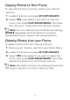 Copying Photos to Your Frame To copy photos from a memory card to your frame’s memory: 1. Locate the photo and press UP/COPY/DELETE. 2. Select YES when asked if you want to copy the photo, then press PLAY/PAUSE/MODE. The frame can copy up to 14 photos to the frame’s memory. n Note: You can rotate photos clockwise by pressing ROTATE repeatedly while the photo is on-screen. Rotated photos are copied in the rotated position. Deleting Photos from your Frame To delete a photo from your frame’s memory: 1.