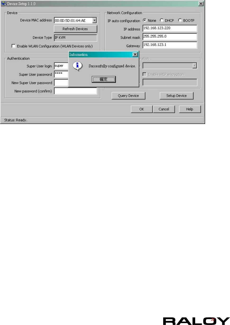 e. Click Setup Device. If super login was authenticated, it’ll show “Successfully configured device”.