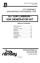 Ramsey Publication No. MIG7 Price $5.00 KIT ASSEMBLY AND INSTRUCTION MANUAL FOR IG7 ION CANNON ION GENERATOR KIT TABLE OF CONTENTS Safety Guidelines .................................4 Ion Theory .............................................6 Learn As You Build .............................13 Parts List .............................................15 Assembly .............................................16 Parts Layout ........................................20 Schematic....................................