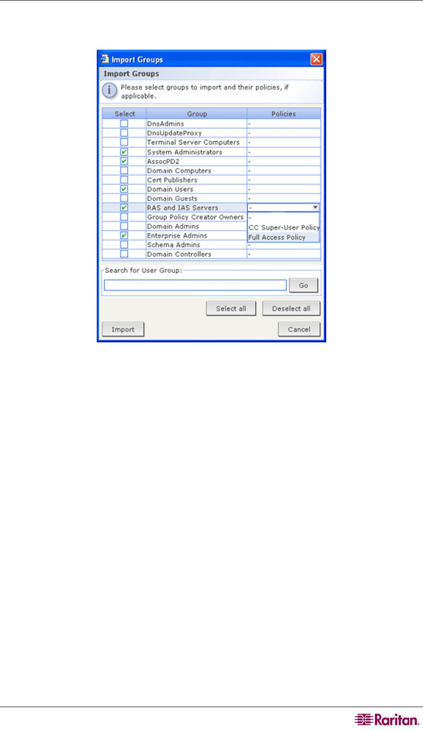 of the user groups are not already on the CC-SG, you can import them here and assign them