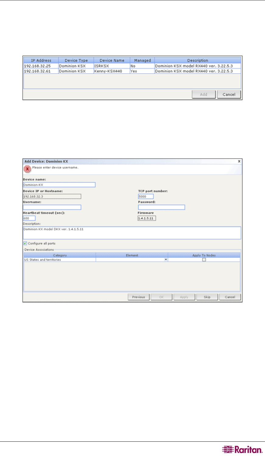 7. To add one or more discovered devices to CC-SG, select the devices from the list, and then