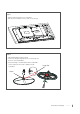 Step 1 1. Take the TV bag and place it on a flat table. 2. Take the TV set and place it face down on the TV bag. Step 2 1. Take the Stand Base and the Hinge. 2. Position the Hinge by aligning the slot on the Hinge and the notch on the Stand Base. 3. Attach the Hinge to the Stand Base with four Size M5 screws, from the bottom, with a Philips head #2 Hinge Slot screwdriver.