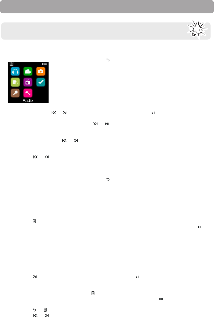 2. Appuyez sur + ou – et ou pour sélectionner Radio puis appuyez sur pour ouvrir le menu Radio.