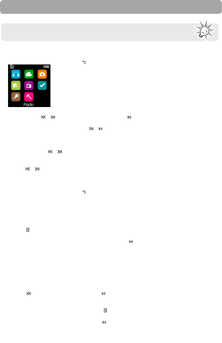 2. Presione + ó – y ó para seleccionar Radio y presione para entrar al menú radio.