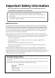 Important Safety Information * Be sure to read all the safety information on this page and inside the manual before you begin to use this product. To reduce risk of injury, charge only rechargeable batteries recommended by the manufacturer for this camcorder. Other types of batteries may burst causing damage and personal injury. FCC Regulations state that unauthorized changes or modifications to this equipment may void the user’s authority to operate it.