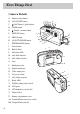 First Things First Camera Details A Shutter release button B LCD ON/OFF button C D E A B D H C EFG (Self Timer)/+ (plus) button I J ZOOM button (Flash)/– (minus) button F DISPLAY button G MENU button H QUALITY/INDEX button I ENTER/MACRO button J Power button K Built-in flash L Self-timer LED K M Auto flash detector P L Q M N R O S T U V N View finder window O Lens P Handstrap eyelet Q Digital output port R Video output port S AC power socket Y T View finder eyepi