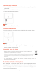 Inserting the SIM card 1. Insert the end of the eject tool into the hole of the card tray and press firmly until the tray pops out. 2. Put one or two nano-SIM cards into the tray. 3. Push the card tray back into the phone. Note Dimensions of a nano-SIM card: 9 mm*12 mm. Charging the battery Connect the phone to the power outlet using the included USB cable and power adapter. Note Your phone and power adapter might heat up while charging.