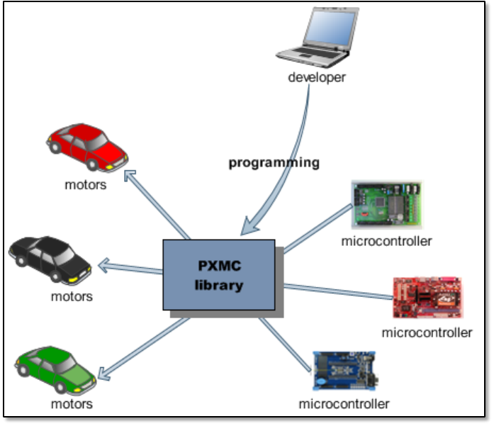A developer, who is represented here by a laptop icon, can use PXMC library to write programs