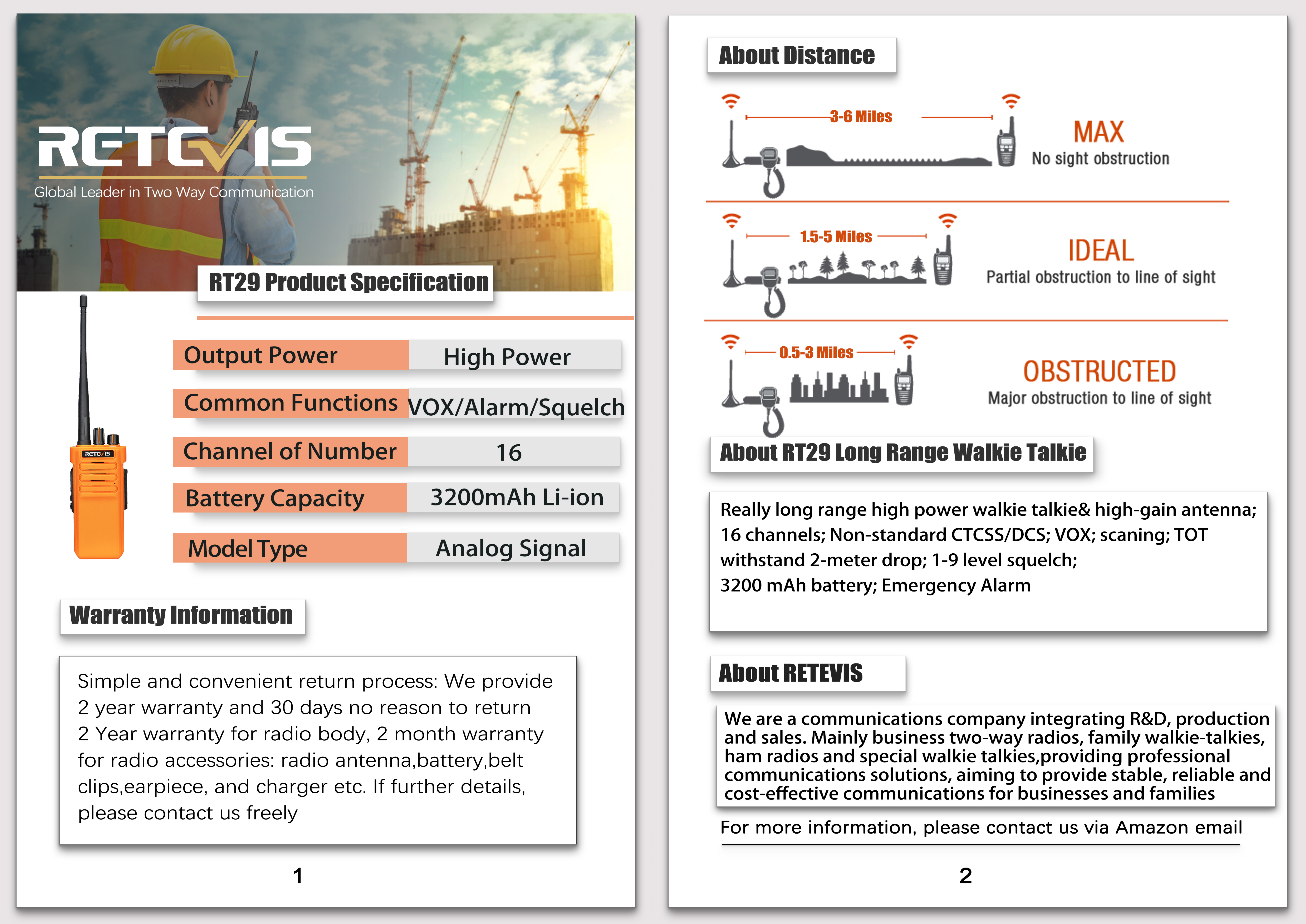 Global Leader in Two Way Com RT Product Specification! High Power 16 3200mAh Li-ion Analog Signal Warranty Information Simple and convenient return process: We provide 2 year warranty and 30 days no reason to return 2 Year warranty for radio body, 2 month warranty for radio accessories: radio antenna,battery,belt clips,earpiece, and charger etc. If further details, please contact us freely About Distance OX/Alarm/Squelch 3-06 Miles a.
