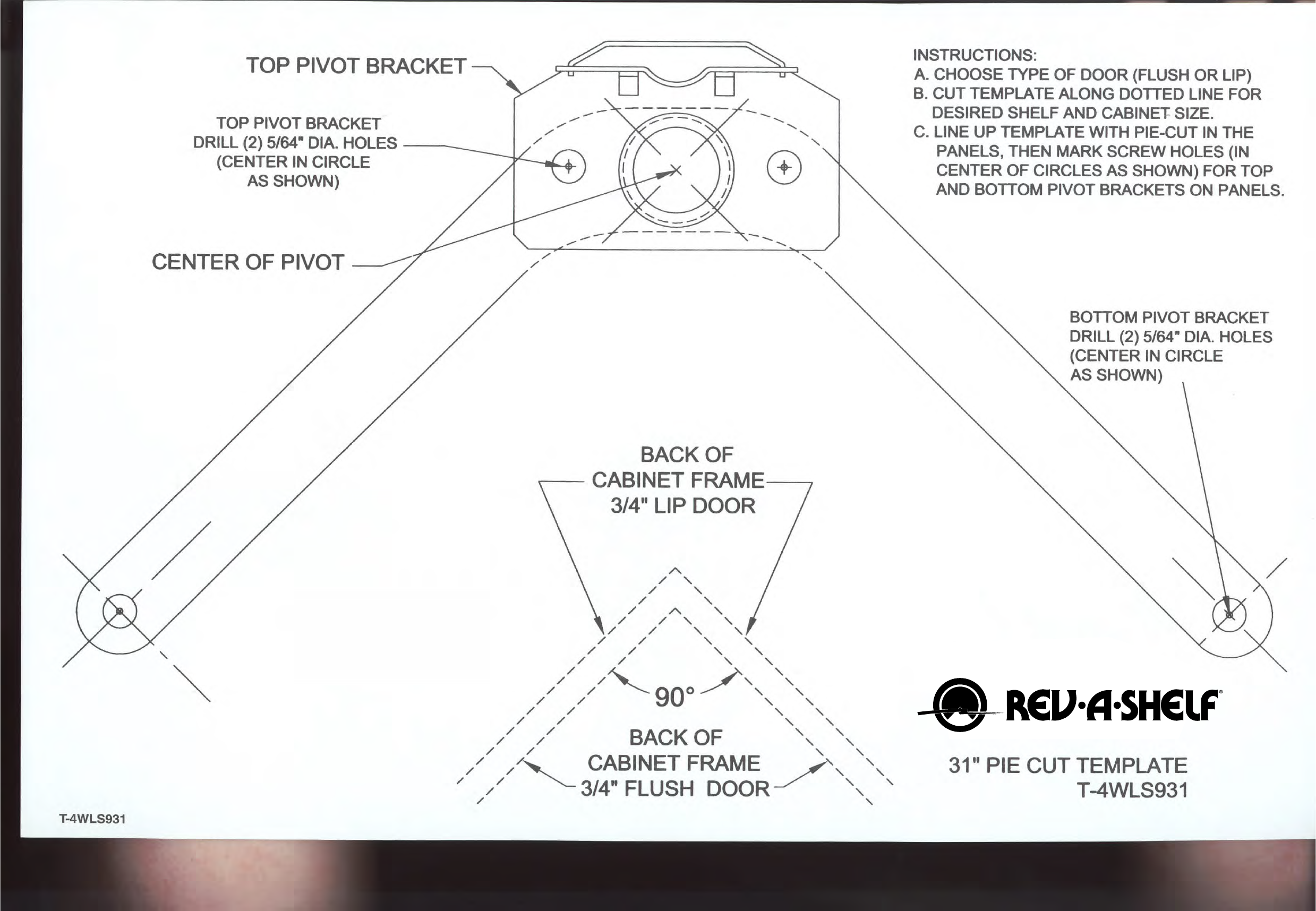 INSTRUCTIONS: TOP PIVOT BRACKET A CHOOSE TYPE OF DOOR (FLUSH OR LIP} ; B. CUT TEMPLATE ALONG DOTTED LINE FOR e DESIRED SHELF AND CABINET SIZE. i COSINE LB TEMPLATE WITH PIE CUT IN THE C Her N are E T T PANELS. THEN MARK SCREW HOLES CENTER OF CIRCLES AS SHOWN) FOR TOP AND BOTTOM PIVOT BRACKETS ON PANELS. CENTER OF PVT iy BOTTOM PIVOT BRACKET DRILL (2) 5/64" DIA. HOLES (CENTER IN CIRCLE AS SHOWN) BACK OF CABINET FRAME . 3/4" LIP DOOR rap REV-SHEW l;’ // BACK /\ CABINET FRAME N 31" PIE CUT TEMPLATE 4 FLUSH DOO