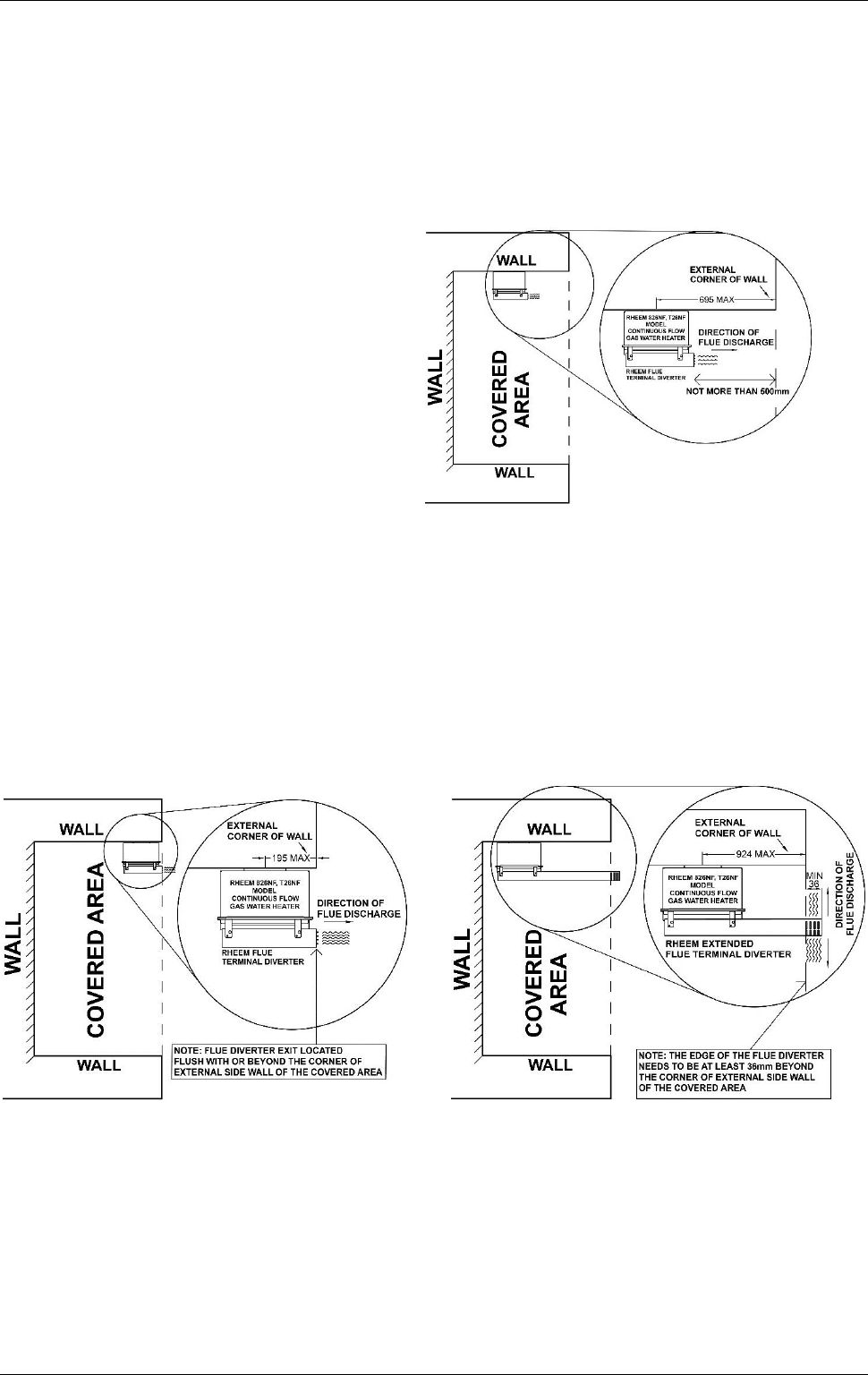 with a Rheem Extended Flue Terminal Diverter (kit number 299285), can also be installed on a side wall within