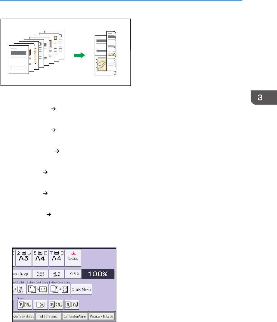 Copies eight 2-sided originals to one sheet with eight pages per side.