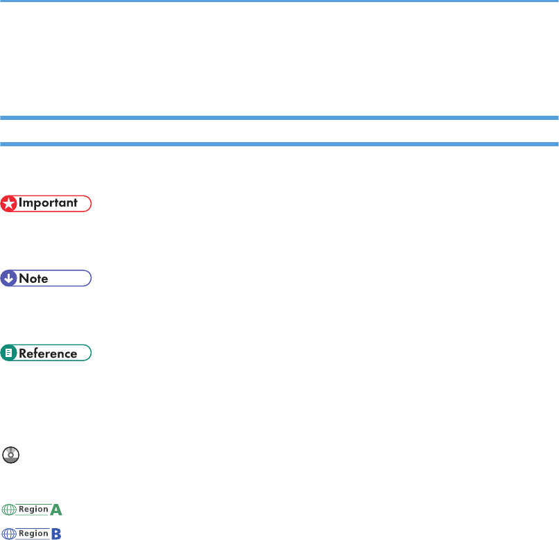 Indicates points to pay attention to when using the machine, and explanations of likely causes of paper