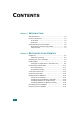 CONTENTS Chapter 1: INTRODUCTION Special Features .................................................. 1.2 Printer Components ............................................. 1.4 Front View ..................................................... 1.4 Rear View ...................................................... 1.5 Understanding the Control Panel ............................ 1.6 Online/Error and Toner Save LEDs .................... 1.6 Cancel button ................................................. 1.