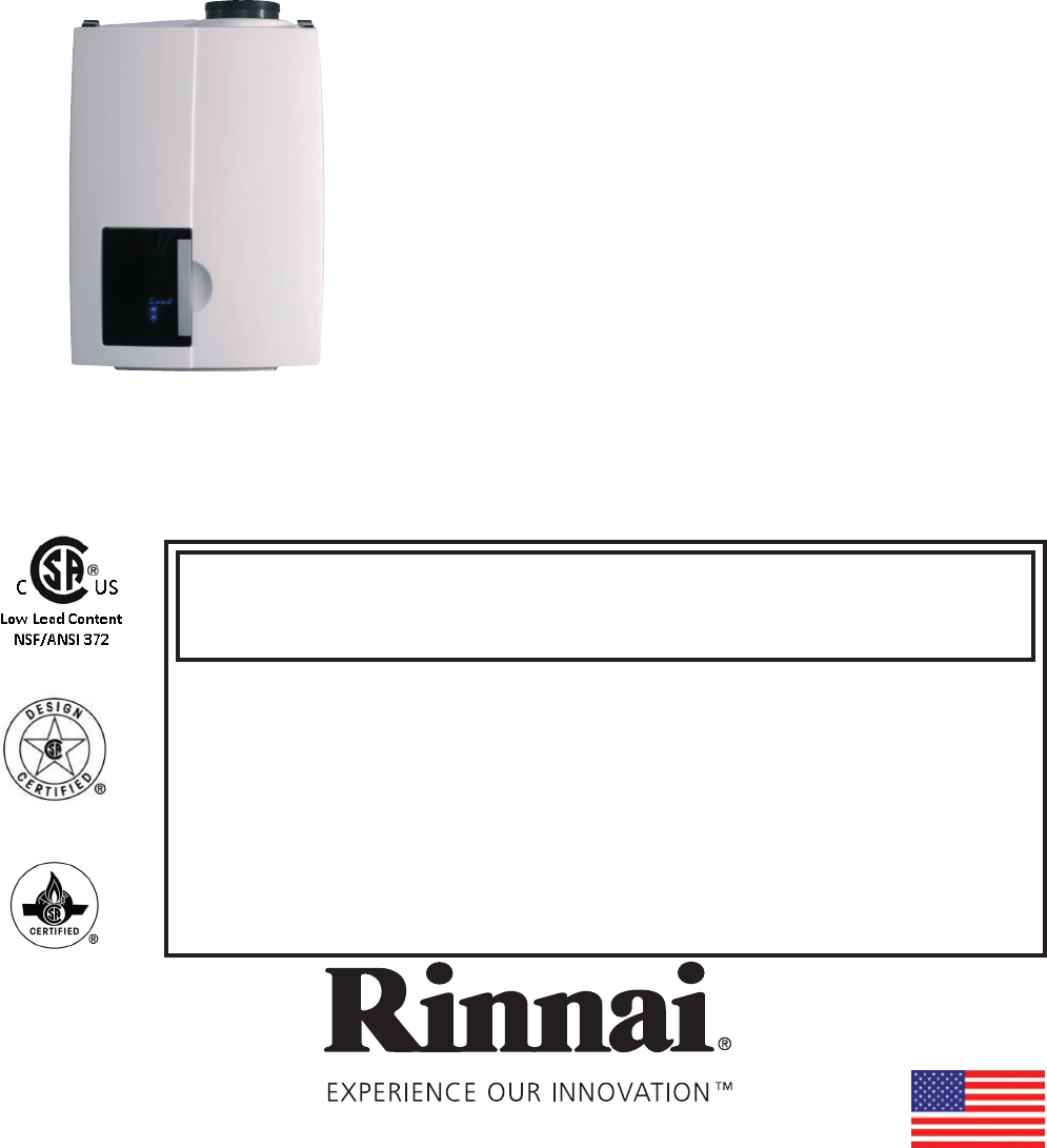 03/2016 Distributor for the USA R i n n a i A m e r i c a C o r p o r a t e • 1 0 3 I n t e r n a t i o n a l D r i v e • P e a c h t r e e C i t y, G A 3 0 2 6 9 Toll Free: (800) 621-9419 • Tel: (678) 829-1700 • Fax: (678) 829-1666 • E-mail: info@rinnai.us • Internet: www.rinnai.us E. & O. E. This renewed publication cancels all previous installation instructions. The company reserves the right to change the specifications and dimensions without prior notice.